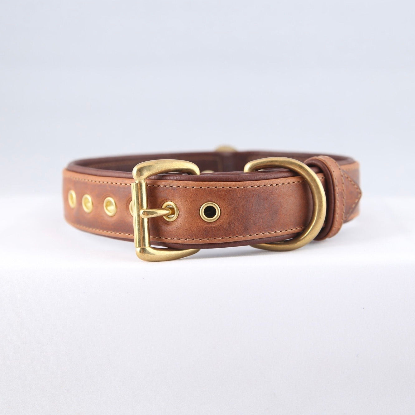 Each k&m collar is specially designed to have the best of both worlds. Genuine leather features combined with solid brass hardware bring an elegant style that can't be beat. Two d-rings and double layer leather offer both function and a sleek edge. Our collars are enhanced with a sliding keeper to make sure that the tail of the collar stays in place no matter what hole your pet may wear their collar on. Each collar is adorned with a FOB of our meaningful logo; a dog's "mirthful" bark. krümmel & mirth collars are designed and crafted in the USA.