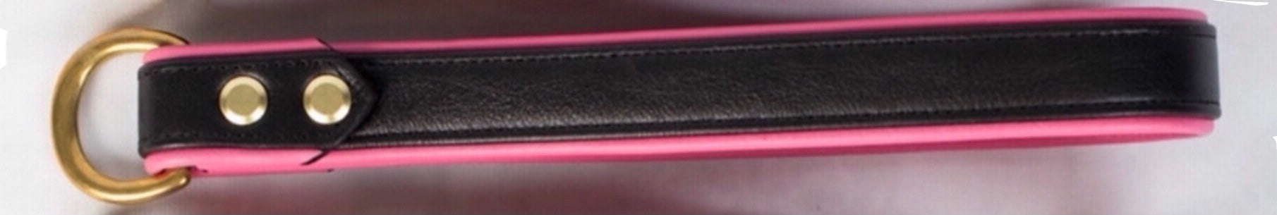 The beauty of the Catalina Grip (*Not Sold Individually) lies in its ability to be combined with any collar and any of our leads, creating a 5' leash. This highly-functional grip permits the attachment of multiple leads at once, revolutionizing the dog-walking experience. With a sophisticated design featuring a double layer of midnight black and hot pink leather, plus solid brass details, the Catalina Grip effortlessly upholds style and performance.